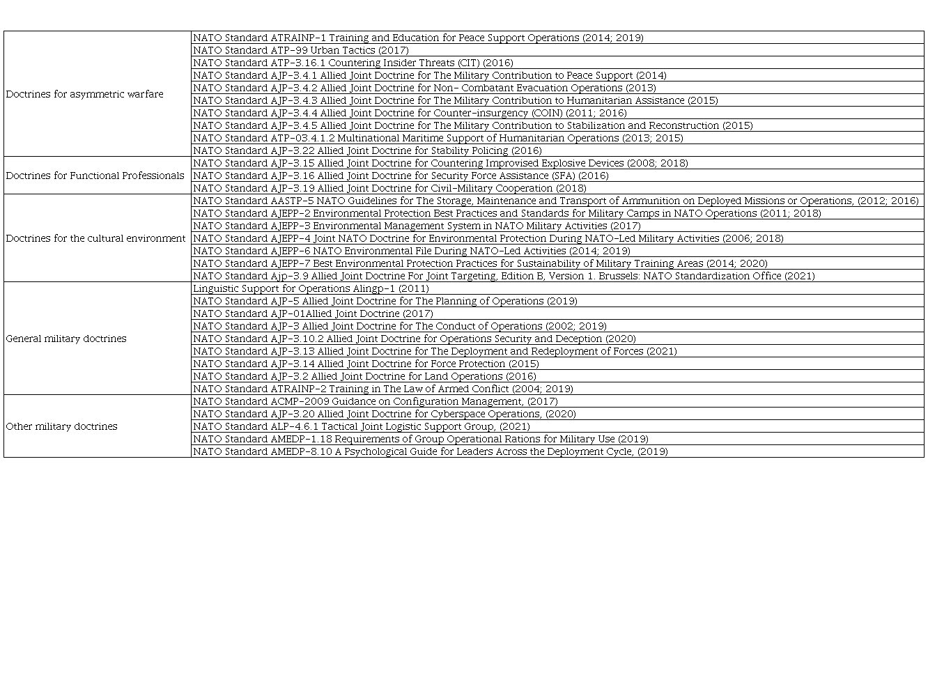 In the research, the primary analysis period comprised all the documents addressing NATO’s involvement in international operations after the Cold War, from August 1990 to January 2022. Since the definition of the cultural element varies depending on the document, all terms, including “culture,” “cultural,” and “culturally,” were examined in the open access military doctrines on the official NATO website (www.nato.int). In total, 79 terms associated with the cultural element were found during the research (see Annex 2). All these keywords were subjected to content analysis in order to distinguish doctrines that contain a cultural element as part of the cultural competencies of military personnel from those that only occasionally mention the word “culture” in all of its forms and are therefore irrelevant to the cultural element as part of the cultural competencies of military personnel. Secondary analysis includes the latest versions (editions) of military doctrines to avoid repeating information from other editions. A total of 45 doctrines (see Annex 1) were selected, which includes the cultural element and covers the term from 2011 to 2022.