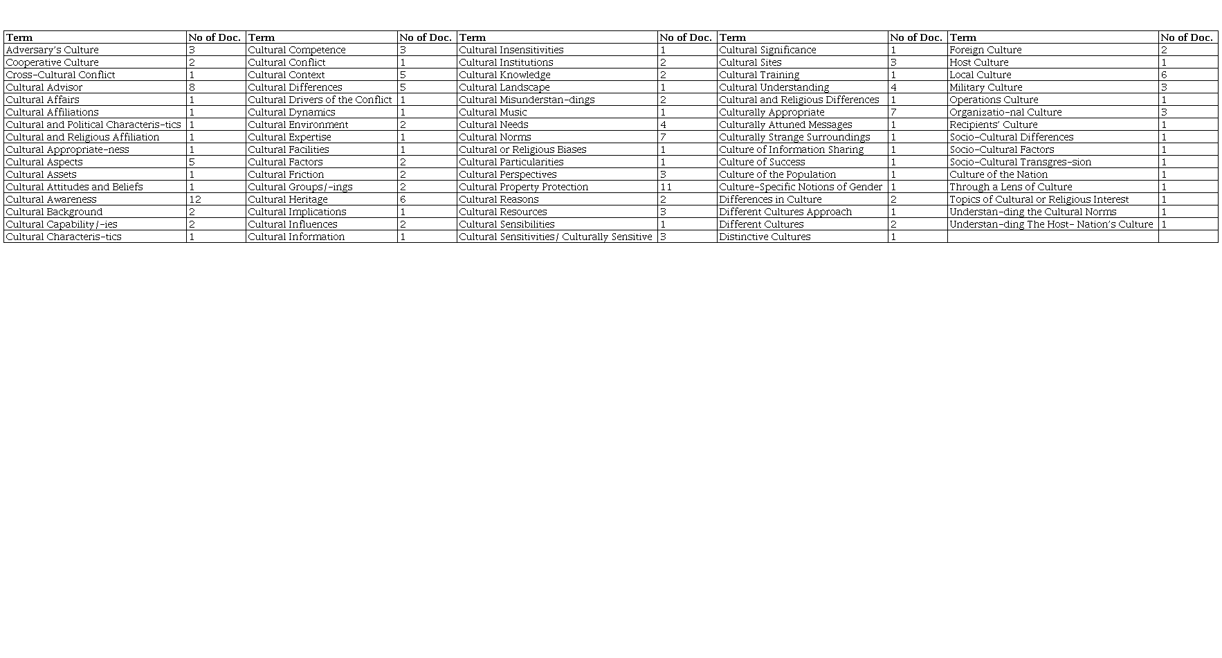 It should be mentioned that there are other military doctrines which sporadically incorporate a cultural element (e.g., the Allied Joint Doctrine for Cyberspace Operations, Guidance on Configuration Management, a Psychological Guide for Leaders Across the Deployment Cycle, etc.). However, this cannot be named as a trend; it is more about a sporadic emphasis on the cultural element that cannot be generalized in one category. Aspects related to the cultural element can be found in these doctrines, such as cultural norms,53 cultural diversity,54 culturally strange surroundings,55 and cultural advisors.56
