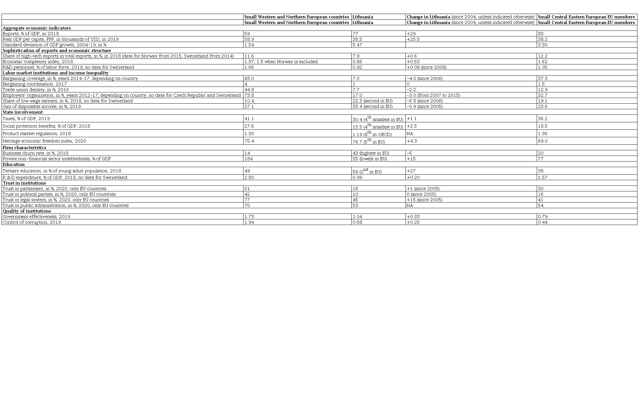 Our analytical strategy consists of explicitly formulating the mechanisms via which the literature considers that democratic corporatist countries can successfully achieve and sustain export success. The independent variables and their interrelationships discussed in the literature on small European democratic corporatist states provide us with a coherent analytical framework to start from. We then turn to Lithuania’s case and trace what explains Lithuania’s exports’ results in the absence of the key elements of democratic corporatism. We rely on statistical data (both Lithuanian and comparative), reports, and secondary sources.