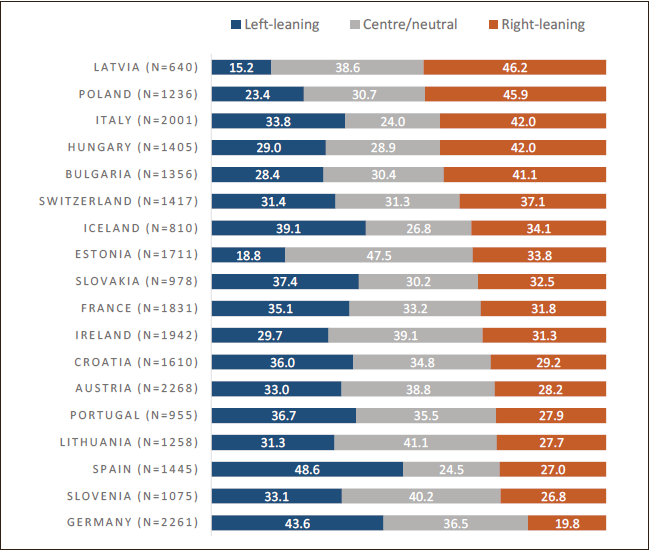 Data concerning the results of citizens’ political positions in European countries have been taken from the European Social Survey (ESS). The indicator Placement on the left-right political scale. was used. Using the ESS scale, where 0 means left and 10 means right, we divided respondents into three groups – respondents choosing [0 to 4] were labelled as a self-reported political left, respondents choosing [6 to10] - as a self-reported political right, and respondents who are in the center of the political spectrum (on the scale choose ‘5’) were identified as neutral. Next, we use the definition of the share of left-leaning, right-leaning, and neutral populations, accordingly.
