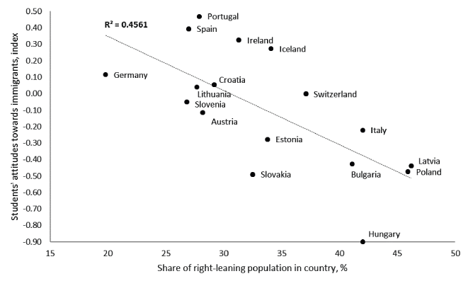 As was mentioned, the highest correlation is observed between students’ attitudes toward immigrants and the share of the right-leaning population in the country (.=-0.657, .=0.004). It can be stated, that lower students’ attitudes towards immigrants are associated with a higher proportion of the right-leaning population in a country (the positions of the countries are shown in Figure 2). The share of the right-leaning population in the country explains 45.61% of the variation in result of the students’ attitudes towards immigrants.