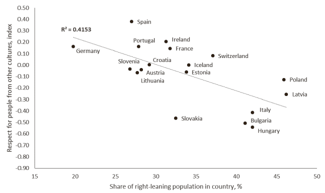 A similar situation is observed when students are asked whether they respect people from other cultures as equal human beings. A strong negative correlation is observed between the index of respect for people from other cultures and the percentage of the right-leaning population in the country (. =-0.642, .=0.004). The positions of the countries can be seen in Figure 3. The share of the right-leaning population in the country explains 41.53% of the variation in result of the respect for people from other cultures.