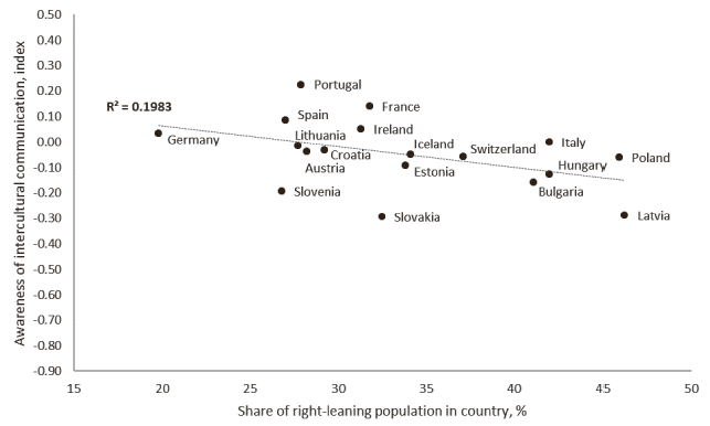 Another significant correlation is observed between the percentage of the right-leaning population in the country and the index of students’ awareness of intercultural communication (.=-0.481, .=0.043). The positions of the countries are shown in Figure 4. The share of the right-leaning population in the country explains 19.83% of the variation in result of the awareness of intercultural communication.