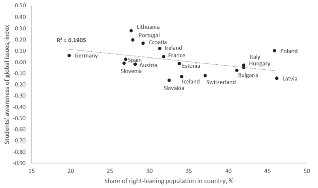 The analysis revealed, that students’ self-reported ability to examine issues of local, global and cultural significance; ability to understand and appreciate the perspectives and worldviews of others; ability to engage in open, appropriate, and effective interactions across cultures, or, in other words, students’ global competence is associated with the share of the right-leaning population in the country. Looking at the particular global competence constructs, we identified, that statistically significant negative correlations are between the share of the right-leaning population in the country and students’ attitudes toward immigrants, respect for people from other cultures, awareness of intercultural communication and students’ awareness of global issues (international conflicts, migration, equality between men and women, causes of poverty, hunger, or climate change). The share of the right-leaning population in the country explains 45.61% of the variation in result of the students’ attitudes towards immigrants, 41.53% of the variation in result of the respect for people from other cultures, 19.83% of the variation in result of the awareness of intercultural communication, and 19.05% of the variation in result of the students’ awareness of global issues.