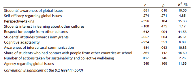 For the correlation and regression analysis, we used all 11 constructs of global competence and the share of the right-leaning population in the country.. We can note that the percentage of the right-leaning population in the country negatively correlates with all global competence constructs except the number of actions taken for sustainability and collective well-being (Table 1). A statistically significant negative correlation is observed between the percentage of the right-leaning population and four global competence constructs: students’ attitudes towards immigrants, respect for people from other cultures, students’ awareness of global issues, and awareness of intercultural communication.