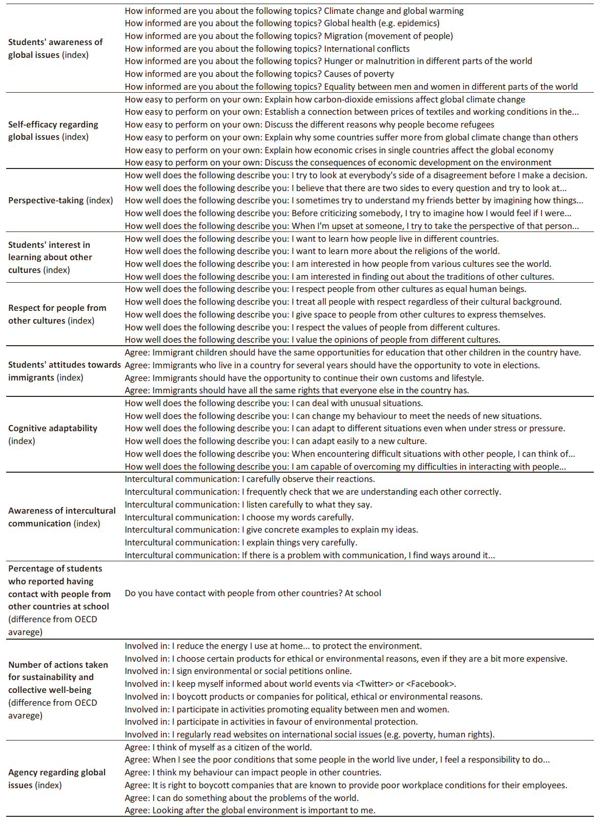 Each of the four dimensions listed in the OECD global competence framework has multiple components. First dimension - examining local, global and intercultural issues focuses on students’ familiarity with specific topics by asking whether students can explain climate change or population growth, migration, causes of poverty, etc. The second dimension focuses on understanding and appreciating the perspectives and worldviews of others. It is assessed by asking students to self-report how well do such statements describe them, e.g.: I try to look at everybody’s side of a disagreement before I make a decision. I am interested in how people from various cultures see the world. I respect people from other cultures as equal human beings. Immigrants should have all the same rights that everyone else in the country has; etc. The third dimension of global competence awareness of intercultural communication assesses the ability to engage in open, appropriate, and effective communication across cultures by asking students to imagine them talking to a person whose native language is different from their own. This hypothetical engagement is then, followed by statements like: I carefully observe their reactions. I frequently check that we understand each other correctly; etc. Lastly in this dimension, students are asked whether they have contact with people from other cultures at school, in their family, neighbourhood and circle of friends. The fourth dimension had two components, first: self-reported information from students on actions taken for sustainability and collective well-being (energy use reduction at home; boycotting products or companies for political, ethical, or environmental reasons; etc.); and second: a sense of agency regarding global issues (do students think of themselves as citizens of the world. do they think their behaviour can impact people in other countries; etc.) The full list of questions and statements can be found in OECD PISA 2018 data website..