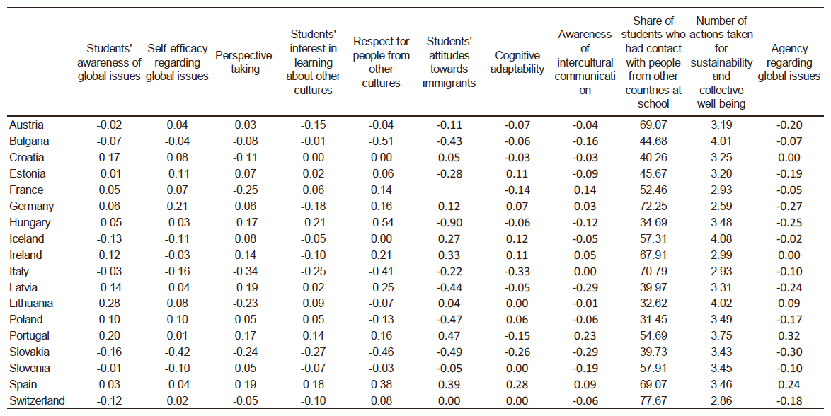 Dataset of the global competencies constructs is presented in Table 3 in Appendix. The positive values of the indices indicate that the global competence is greater than the OECD countries’ average. For example, the positive values in the index of Student awareness of global issues indicate that the student expressed greater awareness of global issues than the average student in the OECD countries.
