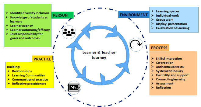 The INTERPEARL model envisages personalised learning as an interactive learner and teacher journey involving four core dimensions: Person, Environment, Process, and Practice (see Figure 1).