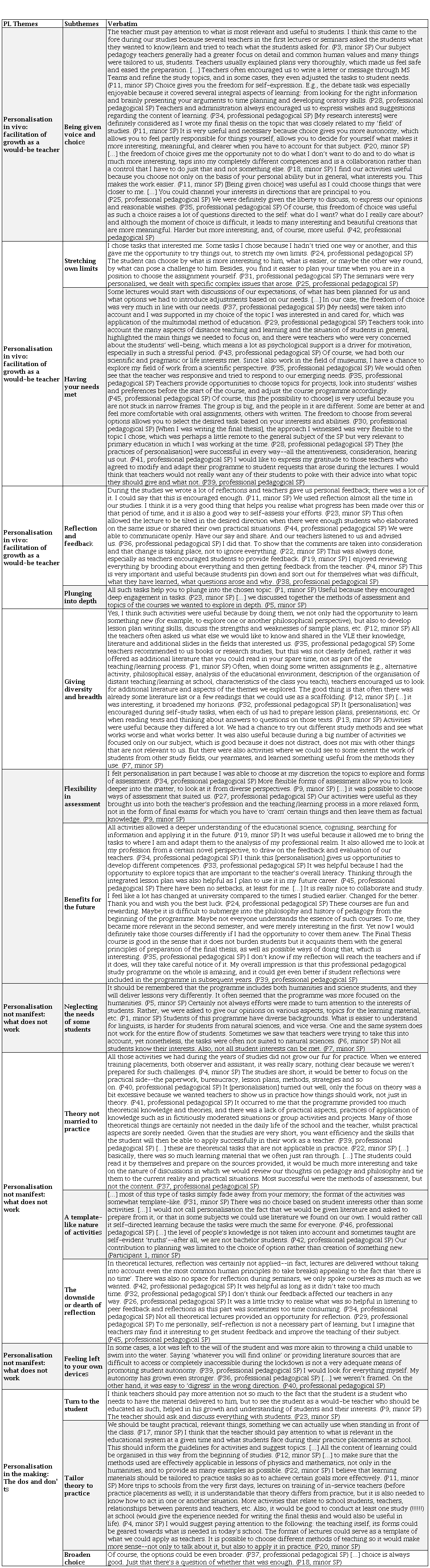 The results of our thematic analysis suggest that instances of PL in the modules General Pedagogy and Final Thesis of the two teacher education study programmes at VU are captured by three major themes: personalisation in vivo: facilitation of growth as a would-be teacher; personalisation not manifest: what does not work; and personalisation in the making: the dos and don’ts (see Table 1). Within each of these themes, students envisioned aspects of PL that were indicative of their own successes and setbacks during studies.