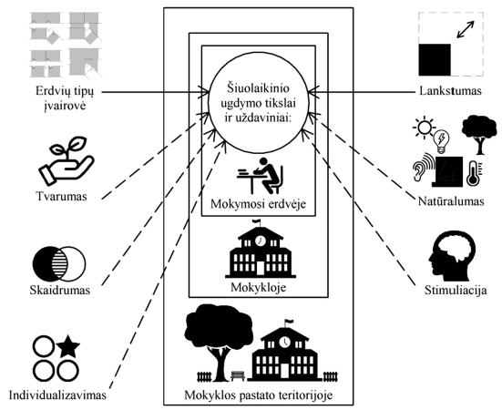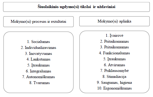 Analizuotuose literatūros šaltiniuose teigiama, kad pedadogika diktuoja fizinės mokymo(si) aplinkos kūrimo sąlygas (Merriënboer et al., 2017; Nordquist, Watter, 2017 ir kt.), todėl 1 pav. pateikiami susisteminti šiuolaikinio ugdymo(si) tikslai ir uždaviniai, išskirti autorės anksčiau atliktuose tyrimuose.