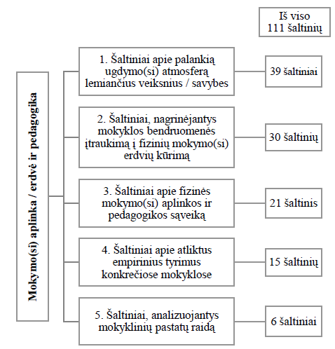 Grupuojant fizinę mokymo(si) aplinką ir pedagogiką analizuojančias mokslo publikacijas (91) pagal jų tyrimo objektą ar aspektą, buvo suformuotos penkios teminės grupės (2 pav.). Kiekybinis šaltinių pasiskirstymas pagal skirtingas temas teikia netiesioginę nuorodą jų didesniam ar mažesniam aktualumui. Daugelis literatūros šaltinių analizuoja ne vieną temą, o dvi ar daugiau temų, todėl kai kuriuos šaltinius galima priskirti kelioms analizuojamoms grupėms. Dėl šios priežasties analizuojamų temų požiūriu šaltinių suminis skaičius yra didesnis (111) nei realusis (91). Reikėtų pažymėti, kad, nepaisant skirtingo tyrimo objekto ar analizės fokuso, visuose šaltiniuose siekiama to paties tikslo – identifikuoti fizinės mokymo(si) aplinkos ir pedagogikos sąsajas, nustatyti fizinės mokymo(si) aplinkos veiksnius, kurie daro įtaką palankiai ugdymo(si) atmosferai.
