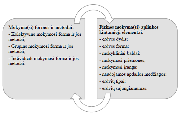 Atlikus sisteminę literatūros šaltinių analizę paaiškėjo, kad ugdymo(si) aplinka kuriama siejant dvi sritis (du elementus – edukaciją ir architektūrą): pedagogiką su fizinės erdvės organizavimu. Atsižvelgiant į mokymo(si) formas ir metodus, mokinių ir mokytojų poreikius, fizinės mokymo(si) erdvės turėtų gebėti keisti savo dydį, formą, mokyklinių baldų, mokymo(si) įrangos, priemonių išdėstymą ir pan. Skirtingos mokymo(si) formos ir metodai lemia įvairiafunkcių ir daugiafunkcių mokymo(si) erdvių poreikį mokyklose, tačiau daugelis mokymo(si) būdų galėtų būti taikomi tose pačiose erdvėse, todėl efektyvu kurti lanksčias erdves, kurios, esant poreikiui, gali būti pritaikytos skirtingai mokymo(si) veiklai. Dabartinės bendrojo ugdymo mokyklos turi užtikrinti kolektyvinio, grupinio ir individualaus mokymo(si) erdves.