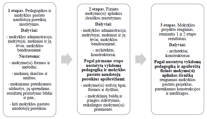 Merriënboer et al. (2017) skiria tris mokyklos pastatų projektavimo etapus (4 pav.). Piispanen (2008) teigia, kad rengiant mokyklos projektą mokytojai gali nurodyti pedagoginius mokymo(si) aplinkos aspektus, mokiniai – fizines mokymo(si) aplinkos savybes, o mokinių tėvai, jeigu reikia, socialines ir psichologines mokymo(si) aplinkos savybes. Antrąjį etapą galima išskirti kaip svarbiausią ir sudėtingiausią, nes jame privalo dalyvauti visos suinteresuotos šalys – nuo mokyklos pastato naudotojų iki architektų ir konstruktorių, todėl čia pasireiškia daugiausia skirtingų nuomonių. Mokytojų ir mokinių dalyvavimas kuriant fizinę mokymo(si) aplinką ypač svarbus pirmais dviem etapais, kur architektams ir konstruktoriams neretai trūksta kompetencijos.
