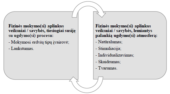 Fizinės mokymo(si) aplinkos kokybę lemiančius veiksnius ir savybes, remiantis atliktų tyrimų analize, galima suskirstyti į dvi grupes: viena jų tiesiogiai susijusi su ugdymo(si) procesu, kita siejama su palankios mokymo(si) atmosferos kūrimu (5 pav.).