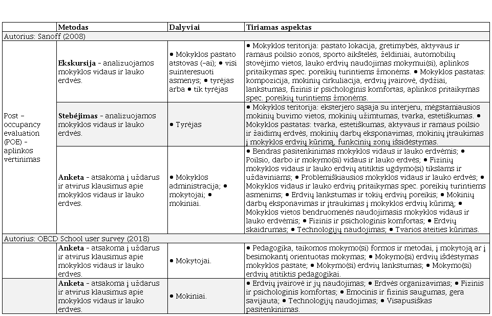 Daugelyje studijų, pateikiančių fizinės mokymo(si) aplinkos ir mokyklos bendruomenės poreikių analizę (Sanoff, 2008; Souza and Kowaltowski, 2017 ir kt.), pabrėžiama mokyklos aplinkos vertinimo proceso (angl. post-occupancy evaluation in school buildings, arba POE) svarba. POE proceso metu informacija apie mokyklos aplinką iš mokyklos pastato naudotojų yra renkama pasitelkiant įvairiausius informacijos rinkimo metodus. 2 lentelėje pateikiami Sanoff (2008) ir OECD School user survey (2018) bendrojo ugdymo mokyklų aplinkai analizuoti naudojami metodai, kurie padeda ištirti skirtingus mokymo(si) aplinkos aspektus.