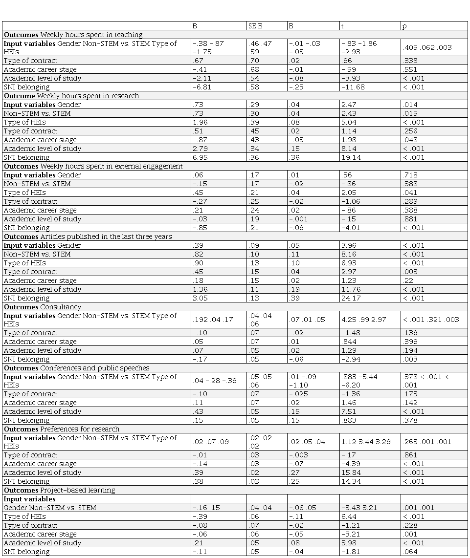 The input variables explain the significative variance (. = 4.07, . < .001, .. = .008) in hours spent in external activities by academics. The result shows that work in HEIs with strong research is positively associated (. = .04, . < .041) to external activities, whereas SNI belonging had a negative (. = -.09, . < .001) relationship with these activities.