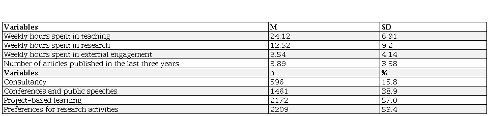 The orientation of the academic activities – teaching, research, and external engagement – has been studied based on establishing the time academics dedicate to each of these tasks, the preferences they have for them, their research productivity (such as the number of articles published), innovative teaching methods (such as project-based learning) (Shin, et. al., 2014), and the most widely used forms of external engagement (Perkmann, et al., 2013).