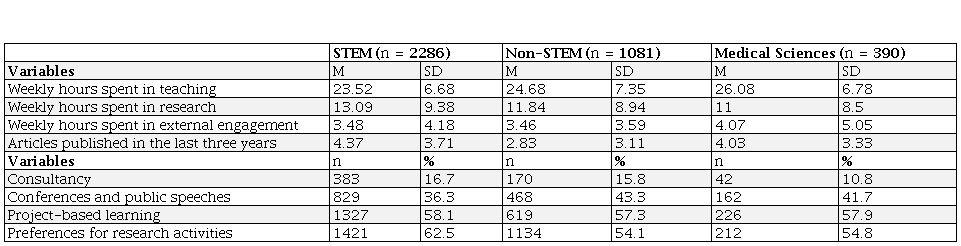 The following tables present the analyses of academic activities according to the differentiating variables. Table 2 indicates that in medical sciences, academics spend more hours teaching; fewer articles were reported in the non-STEM areas than in the other two areas in which, by the way, they express similar numbers; the preference for research is 8 points higher in STEM, consistent with a more significant number of hours dedicated to this activity. In terms of bonding activity, there are fewer academics in medical sciences dedicated to consulting, although they dedicate one more hour to bonding with society, possibly through other means or mechanisms.