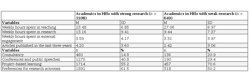 In Table 3 some differences can be noticed in the orientation of the teaching, research, and external engagement activities according to the type of HEIs where the academic works. The results show that the type of HEIs has a substantial differentiating effect in all the variables considered, except in the number of hours dedicated to external engagement. Academics from institutions with “strong research” dedicate more hours to this activity, have more of such a preference and publish more articles than academics from other institutions. It also distinguishes that in HEIs with “weak research,” more academics promote project-based learning as part of teaching methods. In both external engagement activities, there are differences found between the academics of the two types of HEIs: academics from HEIs with weak research resort more to consulting, while a high percentage of those who work at HEIs with strong research mostly hold lectures and speeches as an external engagement activity.