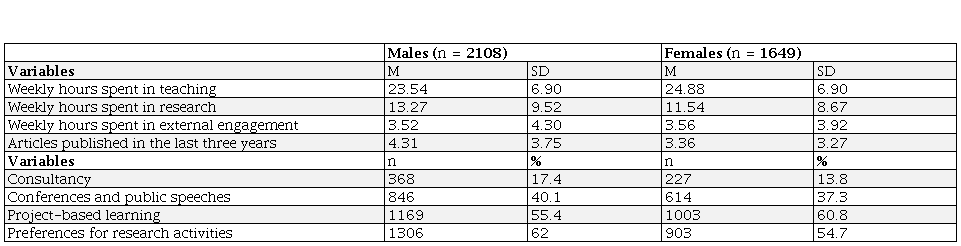 Table 4 shows that males spend lesser hours teaching than females but spend more hours in research. Also, male productivity is slightly higher than female productivity. Hours spent on external activities are similar for both genders. Females use project-based learning more often, thus maintaining a trend observed in 2008 (Estévez, 2014), and men register higher percentages in preference for research.
