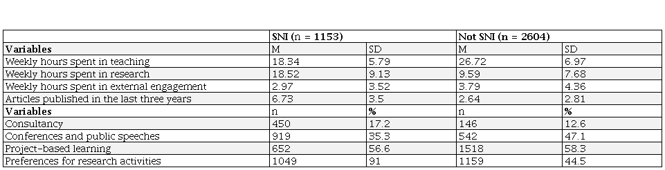 In both external engagement activities, differences are found yet again among academics: those who do not participate in the SNI resort more to consulting as something related to research products, while the members of the SNI selected conferences and speeches as a derivative activity of teaching.