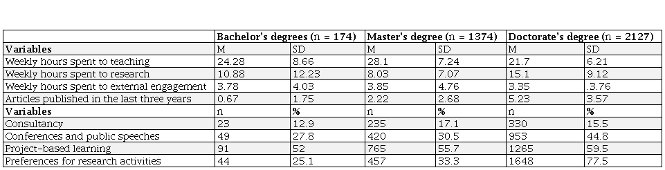 The level of studies of the academic proved to be a differentiating variable only in some of the activities carried out (see Table 6). In this sense, the trend detected in 2008 is confirmed (Galaz et al., 2012): at a higher level of studies, there are higher percentages of academics with a preference for research, and academics with doctorates are those who dedicate fewer hours to teaching and more to research. It draws attention to the fact that academics with master’s degrees dedicate more hours to teaching and less to research than those with a bachelor’s degree. In terms of teaching methods, doctors use project-based learning more than the rest. In external engagement, a difference is observed in the level of studies: conferences and speeches are activities carried out mainly by academics with doctorates.