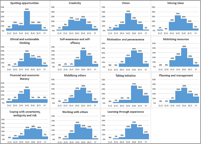 In 13 of the 15 entrepreneurship sub-competencies, less than 10% of the respondents evaluated their sub-competencies as low (below 3 on the Likert scale); however, more than 10% evaluated their creativity (12%) and spotting opportunities (19%) as low. Similarly, when analysing the higher levels of the assessments, there are six sub-competencies that more than a third of respondents rated as high (above 6): taking the initiative (47%), motivation and perseverance (37%), learning through experience (37%), self-awareness and self-efficacy (35%), planning and management (35%), and coping with uncertainty, ambiguity, and risk (33%).