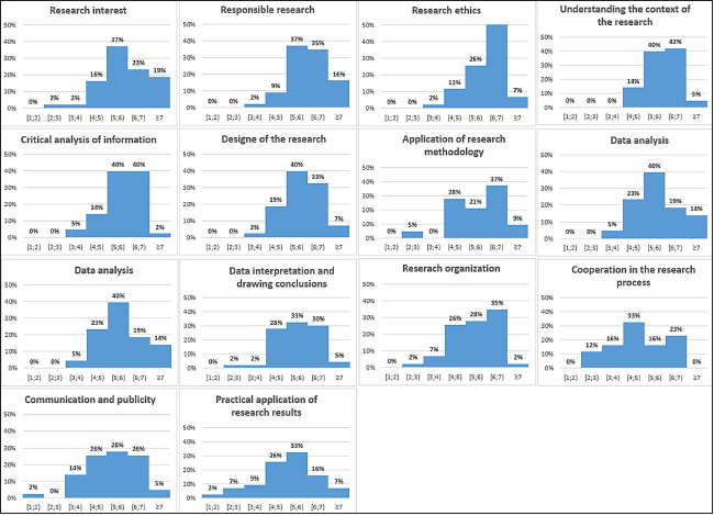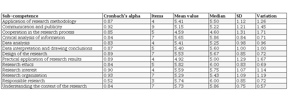 The competence of research was evaluated through 13 sub-competencies: application of research methodology (4 statements), communication and publicity (9 statements), cooperation in the research process (5 statements), critical analysis of information (7 statements), data analysis (4 statements), data interpretation and drawing conclusions (5 statements), design of the research (9 statements), practical application of research results (4 statements), research ethics (5 statements), research interest (4 statements), research organisation (7 statements), responsible research (3 statements), and understanding the context of the research (7 statements).