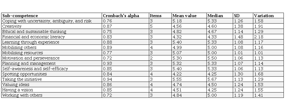 The value of Cronbach’s alpha was calculated for each entrepreneurship sub-competence to determine the internal consistency of the survey (Table 1). Cronbach’s alpha values range from 0.72 to 0.94, indicating that the survey’s internal consistency is considered to be high.