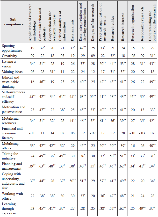 A Spearman’s rank correlation test was performed to determine whether entrepreneurship sub-competencies correlate with research sub-competencies. The results show that there is a strong correlation (.. ≥ 0.6) between only a few sub-competencies: self-awareness and self-efficacy and critical analysis of information (.. = 0.62), mobilising resources and practical application of research results (.. = 0.61), planning and management and communication and publicity (.. = 0.63), planning and management and research interest (.. = 0.62), and learning through experience and research interest (.. = 0.63).