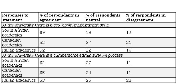 The result was that a depressing managerialism descended down on the academic profession in South Africa, so much so that when the international Changing Academic Profession (CAP) survey of the academic profession took place in 2008, of the 23 participating countries, South African academics scored the highest values on all questions pertaining to managerialism (see Wolhuter et al., 2011). The following can serve as an example: