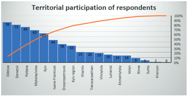 The quantitative ratio of surveyed respondents by territory (oblast) is as follows: (Fig. 3): Donetsk (73 people), Poltava (69), Mykolaiv (63), Kyiv (57), Odesa (54), Ivano-Frankivsk (44), Dnipropetrovsk (36), Kyiv (33), Odesa (24), Kharkiv (21), Zakarpattia (20), Vinnytsia (19), Luhansk (16), Khmelnytsky (14), Volyn (14), Rivne (9), Sumy (5), Kherson (2).