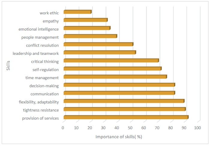 Respondents were also asked to grade skills that they believe are important for the modern expert to perform professional roles and functions (from most to less important skills): critical thinking, stress resistance, analytical thinking, problem-solving, creativity, teamwork, flexibility, adaptability, communication, self-regulation, empathy, respect for diversity, focus on providing services to others, emotional intelligence, people management, comprehensive problem solving, ability to assess the situation and make decisions, work ethic, time management, conflict resolution. The ratio of skills is distributed by respondents as follows (Fig. 4): focus on providing services to others (92%), stress resistance (90%), flexibility and adaptability (89%), communication (82%), ability to assess the situation and accept decision (82%), time management (76%), self-regulation (72%), critical thinking (70%), leadership and teamwork (53%), conflict resolution (51%), people management (39%), emotional intelligence (34%), empathy (32%), work ethic (20%).
