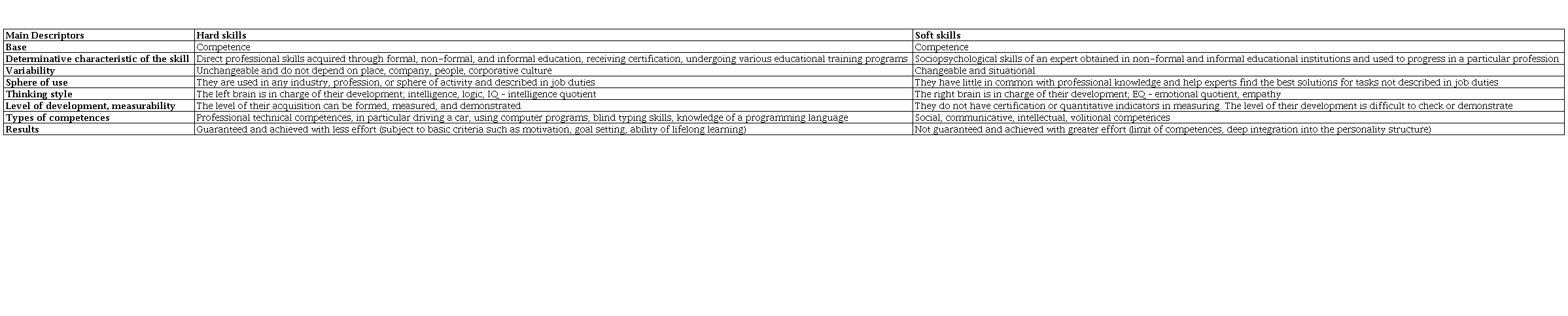 The first point to consider is the difference between hard skills and soft skills. Excelling at hard skills requires intelligence (left brain hemisphere, logic, IQ); developing soft skills requires “emotionality” (right brain hemisphere, EQ, empathy). Hard skills requirements are always the same regardless of the area of application – workplace, corporate culture, professional direction. Soft skills, on the contrary, are fluid and situational, as they are not easy to learn, while their mastery is impossible to predict in terms of time (Fernandes et al., 2021). For example, teaching refers to professional skills, i.e., hard skills: the rules of teaching and the established canonical behavioral forms of a teacher remain the same for every teacher in any educational institution. Communicative skills refer to universal competences – this already refers to soft skills: the rules of constructing effective speech will depend on the audience which the speaker is addressing and on the circumstances of speech themselves (e.g., a presentation at a conference or a conversation in an informal setting).