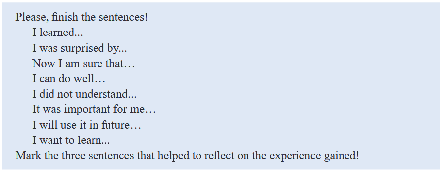 An important way to provoke the student’s metacognition in the learning process is reflection – looking back on their actions, feelings, and thoughts in order to notice, process and analyse one’s experiences. But not all reflection is metacognitive. It depends on the content and form of reflection. Regarding the MC structure and its relationship to transformative learning, there is a question about the content of reflection in the study process. There is an issue for the teacher trainer, how to select the questions for designing the reflection form to initiate all aspects of MC and to promote students’ growth in the next step of thinking, not only on the performance, but on the personal experiences and meanings of one’s activities, feelings, and learning in different contexts, as well (I learned, felt, understand, plan, etc.).