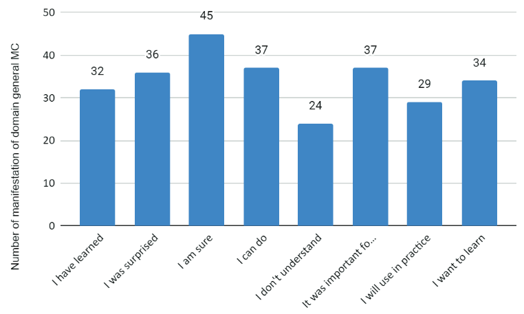 The domain-specific MC relates to the awareness of one’s professional knowledge and skills. In the domain-general MC, an individual’s feelings, emotions, personal significance of the experience are involved as well as life contexts beyond professional activities. These are statements in which students describe their feelings and cognitive processes, or express judgements based on their own perceptions, which are undoubtedly influenced by their experience and life context.