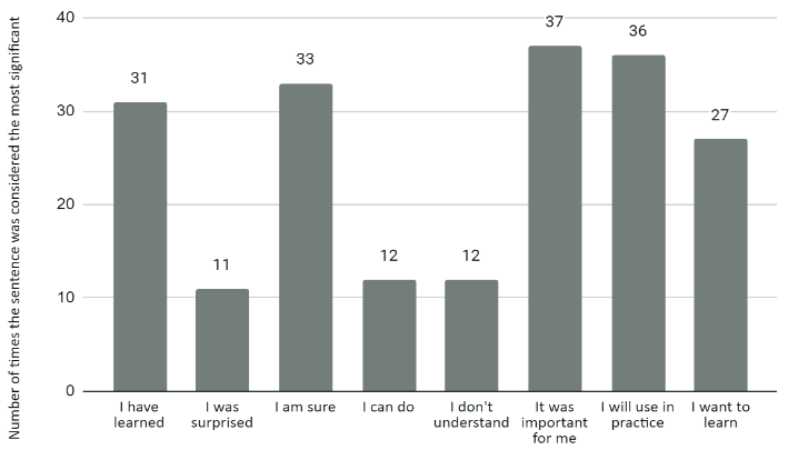 The students’ opinion on the significance of the reflection content differs from Figure 2, which shows how the domain-general MC manifests in students’ responses. The two sentences of about equally high significance in both cases are ‘It was important’ (37 and 37 from 66 responses), namely, the sentence oriented to the awareness of MC context, and ‘Now I am sure’ (45 and 33) which reflects the possibility of experiencing pride and self-esteem.