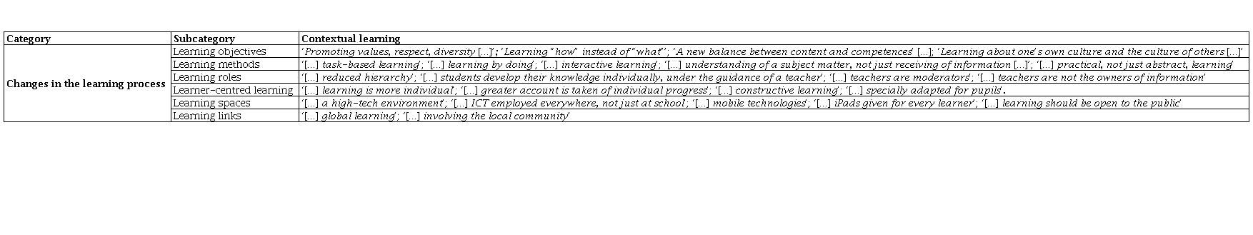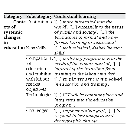 Insights of education experts (school heads) (N = 10) about changes in the teaching/learning environment. The targeted discussion provided insights about current and future trends and their impact on learning. The main changes are contextualised in the field of the national learning system (Table 2). When comparing the findings of the experts with those of the teachers who were asked to focus on school education rather than on the overall big picture of changes in communities, many general aspects of the analysis can be noticed. Both groups of experts and teachers emphasise that technological change will be an important factor affecting the learning environment change. At the heart of the maps of both concepts, the following have been identified: changes in learning strategies and approaches (new emerging competences, assessment procedures with a focus on skills and attitudes rather than fact and knowledge; learning strategies, that make the learner central to the learning process; personalised learning approaches, tailored to individual learning needs and goals; dominance of collaboration-based learning processes, that also change student-teacher relationships, and new learning environments integrated into life and work processes).