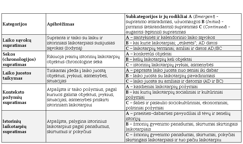 Istorinio laiko supratimo tema tiriama kodavimo rėmui pritaikius istorinio laiko supratimo plėtros modelio penkis mokymosi tikslus ir kiekvieno tikslo išskirtus tris supratimo lygmenis (De Groot-Reuvekamp, Van Boxtel, Ros, Harnett, 2014; De Groot-Reuvekamp, 2017). Kodavimo rėmo kategorijų ir subkategorijų apibrėžimai pateikiami 1 lentelėje.