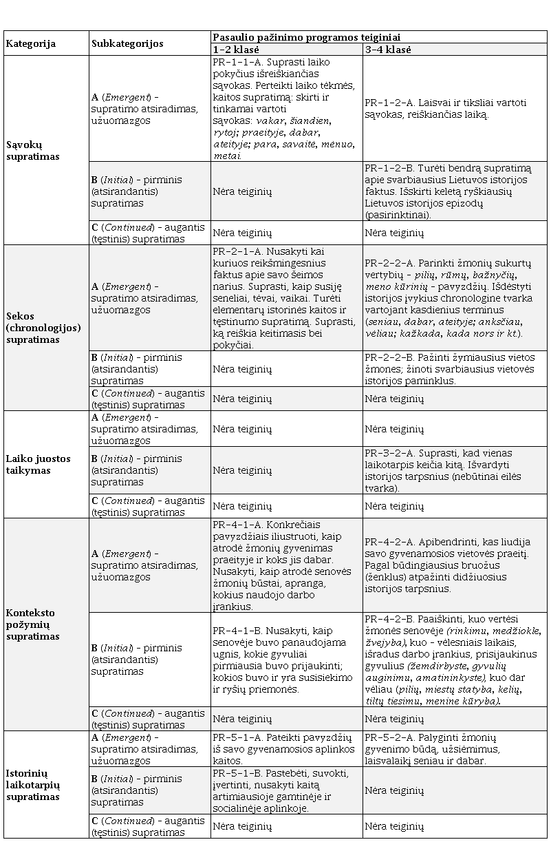 Istorinių laikotarpių supratimas. Istorinių periodų atpažinimo ir lyginimo pasiekimų aprašymai atitinka užuomazgų (A) ir pirminio (B) supratimo lygmenis. Vis dėlto antrame koncentre numatytas lyginimas seniau-dabar principu – akivaizdžiai per žemas pasiekimų lūkestis, nes tą geba atlikti jaunesnio amžiaus mokiniai (Hoodles, 2002; Cooper, 2012). Programos pirmame koncentre nurodytas socialinės aplinkos įvertinimo lūkestis, priešingai, rodo per aukštą pasiekimų lūkestį, nes socialinius pokyčius jaunesni vaikai supranta sunkiau (De Groot Reuvekamp, 2017, p. 50). Tiesa, Lietuvoje atliktas tyrimas parodė, kad didesnė pusė ketvirtokų (58,6 %) tinkamai susiejo slaptą mokymą su carinės Rusijos okupacijos laikotarpiu (Žemgulienė, 2017, p. 431). Tačiau greičiausiai tai per daug sudėtinga būtų suprasti antrokams.