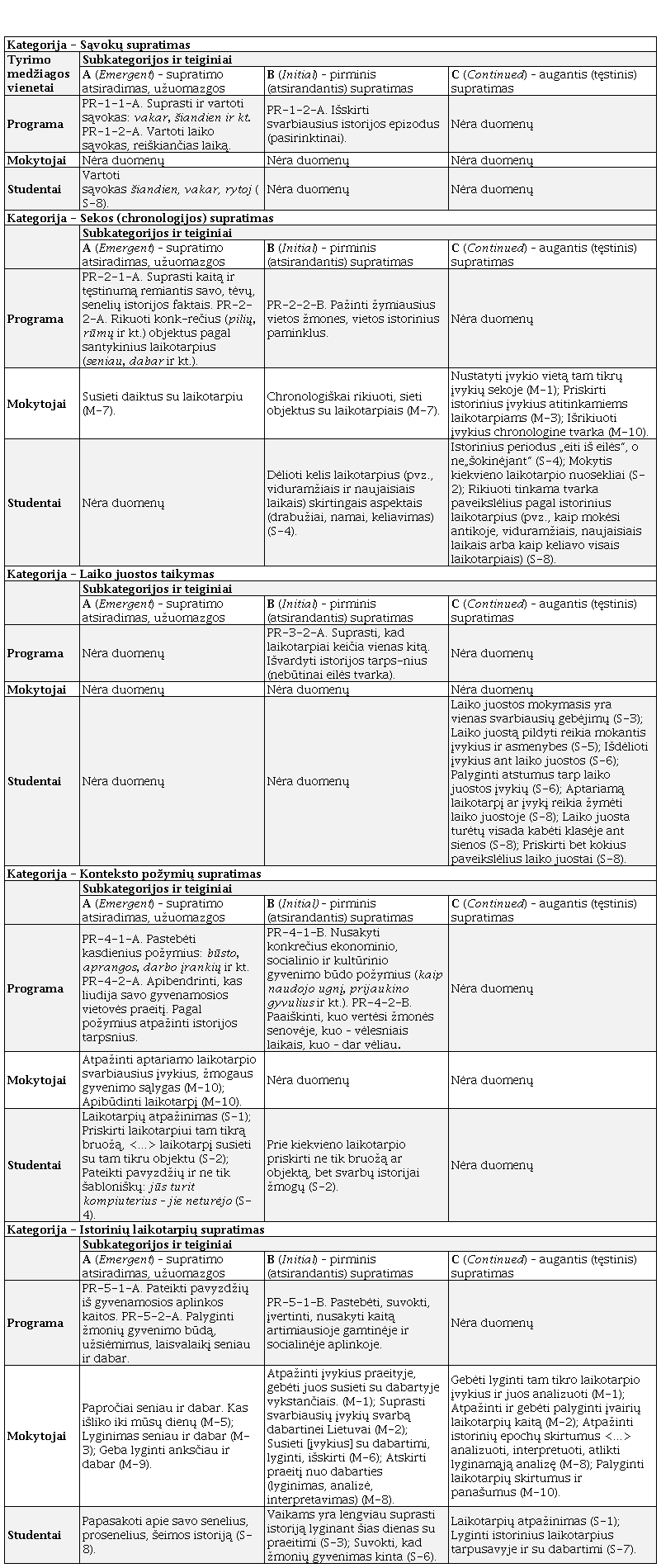 Siekiant įgyvendinti konteksto požymių supratimo ir istorinių laikotarpių supratimo tikslus, pagal programą numatoma ugdyti užuomazgų (A) lygmens ir pirminio supratimo (B) lygmens gebėjimus. Nė vieno tikslo nesiekiama ugdyti augančio supratimo (C) lygmeniu.