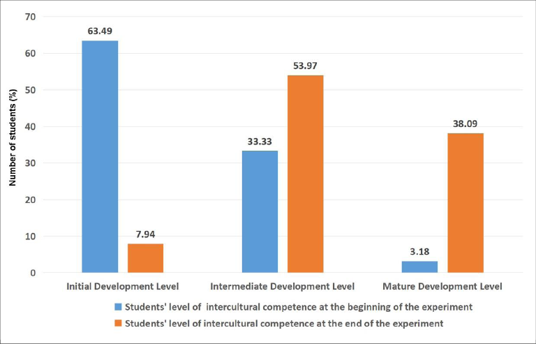 In the future, teachers need to be interculturally competent themselves to prepare their students for success in an interconnected world. Intercultural competence must be acquired during education at a higher education institution. When intercultural competence is an integral part of learning, future teachers are involuntarily learning to build relationships and understand other cultures. Including an intercultural component into a vocational program shows how the intercultural educational space of a higher education institution influences the transformation of students’ values, the system of their perception of diversity, and attitude to it. Particular attention should be paid to the special courses on intercultural competence. Thus, the special course “Intercultural Competence and Intercultural Communication” was not initially welcomed by students, they were indifferent during classes at first. However, the students got involved in activities aptly, practiced intercultural games, and analyzed intercultural situations. Subsequently, the relationships between foreigners and Ukrainians were harmonized, they even started to treat one other differently – with respect and tolerance. An influential principle of the course “Intercultural Competence and Intercultural Communication” was the selection of knowledge from different areas of science, which ensured the development of complex skills that contribute to the formation of intercultural competence of the future teacher. The subject, theoretical and practical tasks of this course have integrated into the system of previously acquired philosophical, cultural, historical, psychological, pedagogical, and other humanitarian knowledge and skills of students. It allowed them to take a new level of judgment and to re-evaluate themselves, to form critical thinking, and to develop the capacity for introspection. Each student assessed a new level of readiness for professional activity, personal qualities as a future specialist, ability to work in a multicultural environment. We observed a redistribution of respondents in groups – significant decrease in the percentage of students on Initial Development Level (the difference is 55.6%), and an increase on Intermediate Development Level (the difference is 20.6%), the calculation of Mature Development Level also showed an increase (the difference is 34.9%). Why was there a large redistribution of respondents in groups according to the levels of intercultural competence at the beginning and the end of the experimental study? The authors suggested that this was due to the attendance of the course “Intercultural Competence and Intercultural Communication”, complementing an intercultural component to different disciplines, various intercultural events and activities, all above created the holistic intercultural educational space at the Institute of Pedagogics and Psychology at Ternopil Volodymyr Hnatyuk National Pedagogical University.