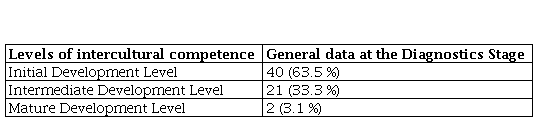 To determine the levels of students’ intercultural competence, the authors modeled the Intercultural Maturity Model developed by R. King and M. Baxter Magolda in 2005 (King, Baxter Magolda, 2005). Levels of intercultural development of future teachers at the beginning of the experiment were the following: Initial Development Level – 40 people (63.5%), Intermediate Development Level – 21 people (33.3%), Mature Development Level – 2 people (3.1%). The data are presented in Table 2 and Table 3.