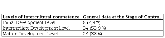 According to the results of the experiment, at the Stage of Сontrol the following levels of intercultural development of future teachers were revealed: Initial Development Level – 5 people (7.9%), Intermediate Development Level – 34 people (53.9%), Mature Development Level – 24 people (38%). The data are presented in Table 4. Figure 1 shows the comparative analysis of the levels of intercultural competence at the Diagnostics Stage and the Stage of Сontrol in percentages.