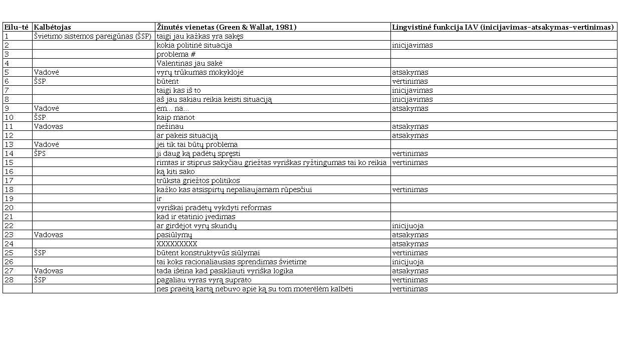 Nepaisant to, kad pokalbis vyko apie švietimo sistemos problemų sprendimą, vis dėlto vyraujantys stereotipai ir diskriminacija dėl lyties šias problemas tik gilino. Pokalbio metu dominavęs švietimo specialistas naudojosi savo galia ir įtaka bei griežtai kontroliavo vykusį pokalbį, įspraudęs jį į inicijavimo–atsakymo–vertinimo (IAV) (angl. IRE – initiation–response–evaluation) rėmus, primenančius tardymą ir parodančius galios pozicijos viršenybę (Mehan, 1985). Tokiu būdu inicijuojama sąveika yra įprasta galios diskursui, nes didesnę galią demonstruojantis asmuo inicijuoja klausimų, į kuriuos atsako žemesnes hierarchines pozicijas užimantis asmuo, pateikimą, o paskui iniciatorius atsakymą įvertina. Šioje situacijoje aukštas pareigas einantis švietimo sistemos pareigūnas naudojo IAV prieigą siekdamas identifikuoti politinį diskursą, apimantį mokyklų vadoves moteris ir jų įtaką bei padėtį švietimo sistemoje.