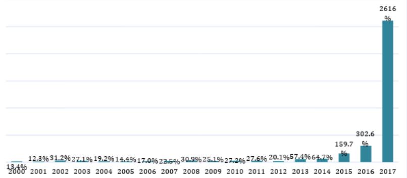 El siguiente gráfico muestra la evolución de la inflación acumulada en Venezuela para el período de 2000-2017.
