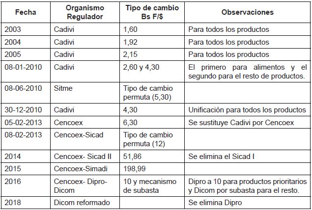 El siguiente cuadro recoge el historial de los distintos sistemas cambiarios de los gobiernos bolivarianos.