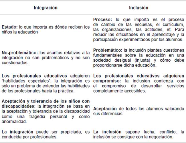 Es importante distinguir entre el concepto integración e inclusión educativa. Así Oliver (1996) distingue claramente entre estos dos movimientos el de integración y el de inclusión, señalando las diferencias entre ellos.