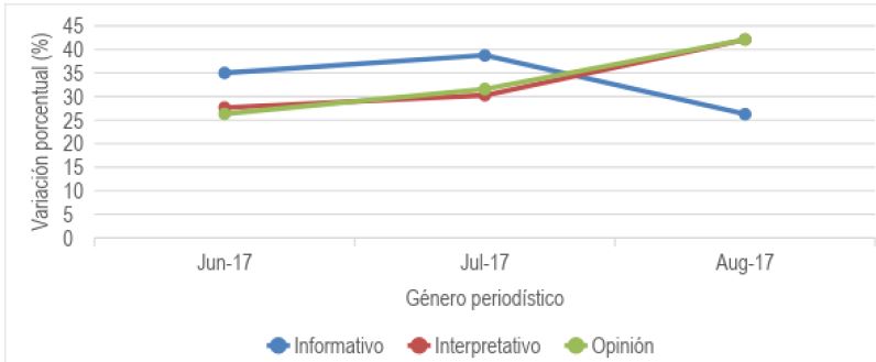 En los contenidos periodísticos analizados, se observa la predominancia del género informativo (35%), en los inicios de la huelga magisterial, el pico más alto lo alcanza en el mes central del conflicto (39%), para descender ostensiblemente a finales (26%). Los géneros interpretativo y de opinión corren de manera paralela en la construcción de la noticia, es decir, de manera creciente en la evolución del conflicto.