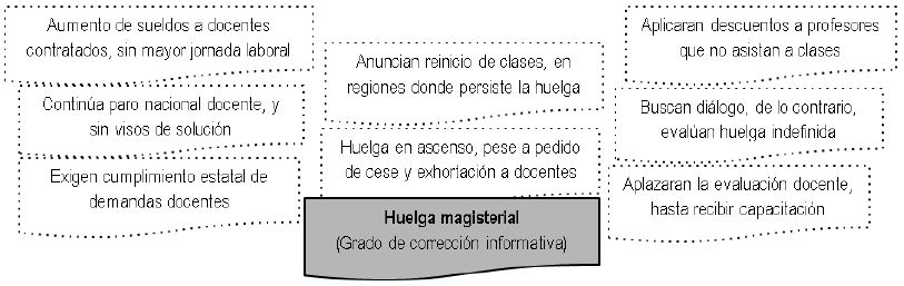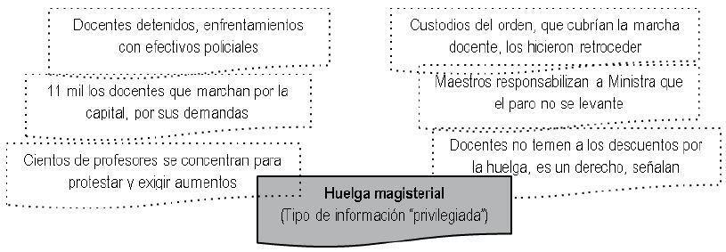 El tipo de información "privilegiada" traduce, en mayor grado, resultados "escandalosos", más que en la explicación de causas o efectos. Estas priorizaciones remiten a conjeturas sobre "Docentes. indican que se defenderán legalmente si se procede con los descuentos o se llega a los despidos", "[Ministra] exhorta a docentes iniciar clases este 7 de agosto, mientras se agudizan protestas en Huancavelica, Piura y Puno", "Profesores del sur del país realizaron diversas movilizaciones, y en algunos casos se registraron algunos disturbios". En ese sentido, la prensa sintetiza el devenir de la huelga docente mostrando su desarrollo, sin resaltar los avances tenidos en torno a su resolución, obvian así, la vigencia de una agenda de problemas que induzca a un análisis reflexivo, sobre la necesidad del "incremento de la partida presupuestaria del sector educación al 6% del PBI y la suspensión de las evaluaciones [punitivas] de los maestros" (Canessa, 2017).